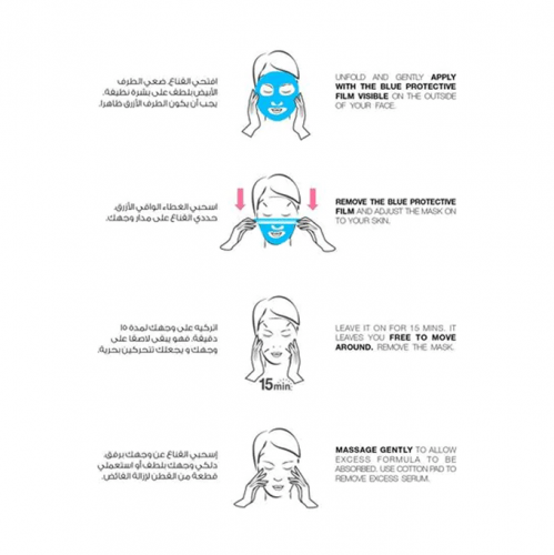 ضعي القناع على بشرة نظيفة تماما، وتأكدي ان يكون الغشاء الأزرق للخارج. ضعيه برفق على الجلد واتركيه لمدة 15 دقيقة. لإزالة القناع، انزعيه بلطف من الأطراف ودلكي برفق.