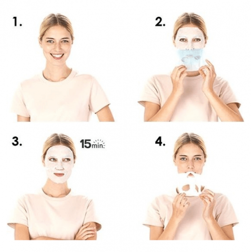 ضعي القناع على بشرة نظيفة تماما، وتأكدي ان يكون الغشاء الأزرق للخارج. ضعيه برفق على الجلد واتركيه لمدة 15 دقيقة. لإزالة القناع، انزعيه بلطف من الأطراف ودلكي برفق.
